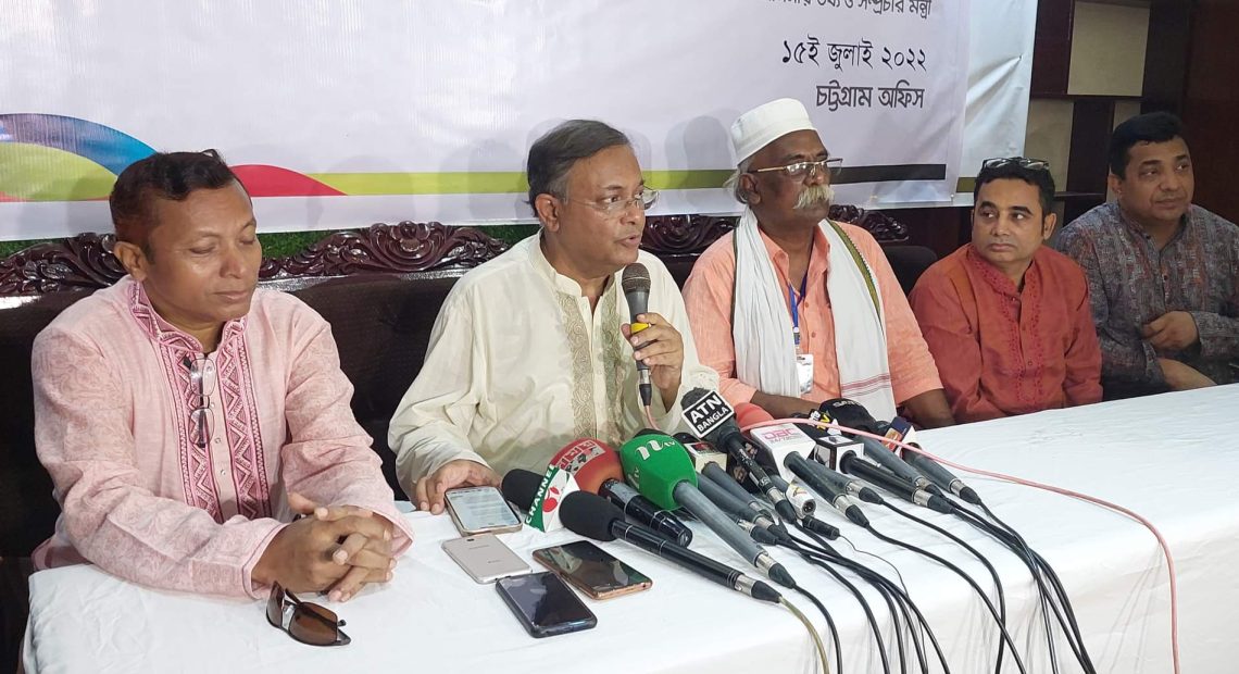 শুক্রবার (১৫ জুলাই) বিকেলে চট্টগ্রাম প্রেস ক্লাবের এস রহমান হলে বাংলাদেশ শ্রীলঙ্কা হতে পারে জাতীয় পার্টির চেয়ারম্যান জিএম কাদেরের বক্তব্য ও বাংলাদেশের রিজার্ভ এখন সর্বকালের সর্বনিম্ন পর্যায়ে গেছে বলে বিএনপির যুগ্ন মহাসচিব রুহুল কবির রিজভীর বক্তব্যের বিষয়ে সাংবাদিকদের প্রশ্নের জবাবে এসব কথা বলেন তথ্যমন্ত্রী। এর আগে স্যাটেলাইট টেলিভিশন এটিএন বাংলার ২৫ তম প্রতিষ্ঠাবার্ষিকীর কেক কাটেন তথ্য ও সম্প্রচার মন্ত্রী।