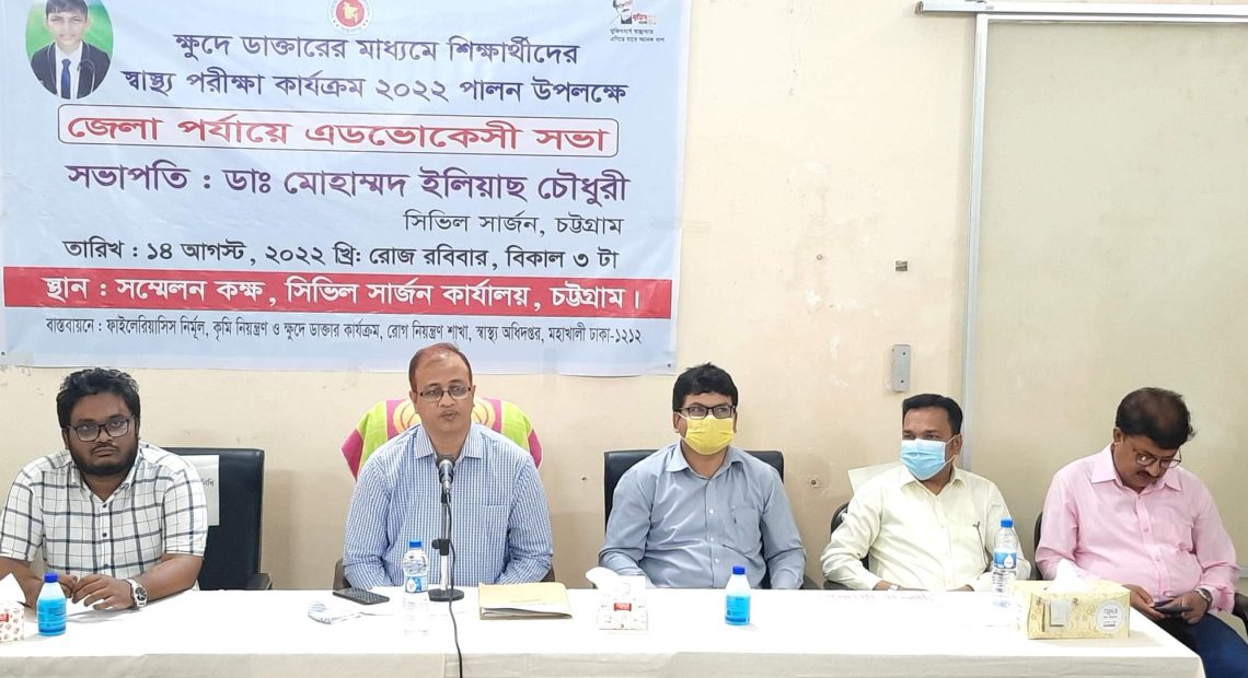 আগামী ২০-২৫ আগস্ট পর্যন্ত অনুষ্ঠিতব্য ক্ষুদে ডাক্তারের মাধ্যমে শিক্ষার্থীদের স্বাস্থ্য পরীক্ষা কার্যক্রম-২০২২ পালন উপলক্ষে জেলা পর্যায়ে এডভোকেসী সভা আজ ১৪ আগস্ট ২০২২ ইংরেজি রোববার সকাল ১১টায় নগরীর আন্দরকিল্লাস্থ চট্টগ্রাম জেলা সিভিল সার্জন কার্যালয়ের সম্মেলন কক্ষে অনুষ্টিত হয়। সিভিল সার্জন ডা. মোহাম্মদ ইলিয়াছ চৌধুরীর সভাপতিত্বে ও জেলা স্বাস্থ্য তত্ত¡াবধায়ক সুজন বড়–য়ার সঞ্চালনায় অনুষ্টিত সভায় মাল্টিমিডিয়ার মাধ্যমে মূল প্রবন্ধ উপস্থাপন করেন সিভিল সার্জন কার্যালয়ের এমওডিসি ডা. মোহাম্মদ নুরুল হায়দার। স্বাগত বক্তব্য রাখন লোহাগাড়া উপজেলা স্বাস্থ্য ও পঃ পঃ কর্মকর্তা ডা. মোহাম্মদ হানিফ। রিসোর্স পারসন হিসেবে উপস্থিত থেকে বক্তব্য রাখেন জেলা মাধ্যমিক শিক্ষা অফিসার মোঃ ফরিদুল আলম হোসাইনী, বিশ্ব স্বাস্থ্য সংস্থার এসআইএমও ডা. এফ.এম জাহিদুল ইসলাম, সীতাকুÐ উপজেলা স্বাস্থ্য ও পঃ পঃ কর্মকর্তা ডা. মোঃ নুর উদ্দিন, বিভাগীয় টিবি এক্সপার্ট ডা. বিপ্লব পালিত। অন্যান্যের মধ্যে বক্তব্য রাখেন কর্ণফুলী উপজেলা মাধ্যমিক শিক্ষা অফিসার বাবুল চন্দ্র নাথ, রাউজান উপজেলা প্রাথমিক শিক্ষা অফিসার আবদুল কুদ্দুছ ও বোয়ালখালী উপজেলা প্রাথমিক শিক্ষা অফিসার গোলাম রহমান চৌধুরী প্রমূখ। সভায় বিভিন্ন উপজেলা স্বাস্থ্য ও পঃ পঃ কর্মকর্তা, প্রাথমিক ও মাধ্যমিক শিক্ষা কর্মকর্তা, প্রতিনিধি, শিক্ষক, স্যানিটারী পরিদর্শক, স্বাস্থ্য পরিদর্শক, স্বাস্থ্য কর্মী এবং এনজিও প্রতিনিধিরা উপস্থিত ছিলেন। স্বাস্থ্য অধিদপ্তরের রোগ নিয়ন্ত্রণ শাখার ফাইলেরিয়াসিস নির্মূল, কৃমি নিয়ন্ত্রণ ও ক্ষুদে ডাক্তার কার্যক্রমের বাস্তবায়নে জেলা সিভিল সার্জন কার্যালয় এডভোকেসী সভার আয়োজন করেন।