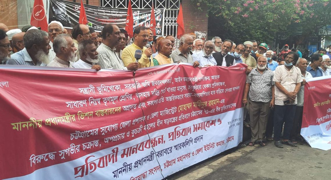 মানববন্ধন ও প্রতিবাদ সমাবেশে বক্তারা বলেন, সন্ত্রাসী, ভূমিদস্যু, পাহাড়খেকো, দখলবাজ, আইন অমান্যকারী, দুর্নীতিবাজ ও অপশক্তির আতংক চট্টগ্রাম জেলা প্রশাসক মোহাম্মদ মমিনুর রহমান। ডিসি হিসেবে তিনি চট্টগ্রামে যোগদানের পর থেকে জাতির পিতা বঙ্গবন্ধু শেখ মুজিবুর রহমানের সুযোগ্য কন্যা মাননীয় প্রধানমন্ত্রী শেখ হাসিনার নির্দেশনায় সরকারের উন্নয়ন কর্মকান্ড গতিশীল ও দৃশ্যমান করতে সততা, দক্ষতা ও সাহসিকতার সাথে কাজ করে যাচ্ছেন। তিনি চট্টগ্রাম দরদী ও সর্বস্তরের বীর মুক্তিযোদ্ধাদের অকৃত্রিম বন্ধু। ভূমিদস্যু পাহাড়খেকো ও লুঠেরার দল চট্টগ্রামের উন্নয়ন বাঁধাগ্রস্ত করতে যোগ্য জেলা প্রশাসক (ডিসি) মোহাম্মদ মমিনুর রহমানের বিরুদ্ধে ষড়যন্ত্র শুরু করেছে। স্বার্থান্বেষী কুচক্রীমহল জেলা প্রশাসকের বিরুদ্ধে মিথ্যাচার ও অপপ্রপ্রচার চালিয়ে তাঁকে চট্টগ্রাম থেকে বদলীর পাঁয়তারা করছে। বর্তমান ডিসিকে হারালে চট্টগ্রামের উন্নয়ন অবশ্যই বাঁধাগ্রস্ত হবে। তার মত জেলা প্রশাসক পাওয়া চট্টগ্রামবাসীর জন্য গৌরবের। তার ভিতরে-বাইরে আমলাসূলভ কোন আচরণ নেই। বিগত দিনের জেলা প্রশাসকেরা যে কাজগুলো করতে সাহস করেনি তা বর্তমান জেলা প্রশাসক মোহাম্মদ মমিনুর রহমান সাহসিকতার সাথে করছে। চট্টগ্রামকে ধ্বংস হতে দেয়া যাবেনা। চট্টগ্রামের চলমান উন্নয়নের স্বার্থে সর্বস্তরের বীর মুক্তিযোদ্ধা ও জনগণকে সাথে নিয়ে ডিসি’র বিরুদ্ধে সকল ষড়যন্ত্র রুখে দিতে হবে। ডিসি’র বিরুদ্ধে যারা ষড়যন্ত্র করছে বা অপপ্রচাওে লিপ্ত রয়েছে তাদের বিরুদ্ধে বিচার বিভাগীয় তদন্তে ব্যবস্থা করতে মাননীয় প্রধানমন্ত্রীর নিকট উদাত্ত আহবান জানান বক্তারা।