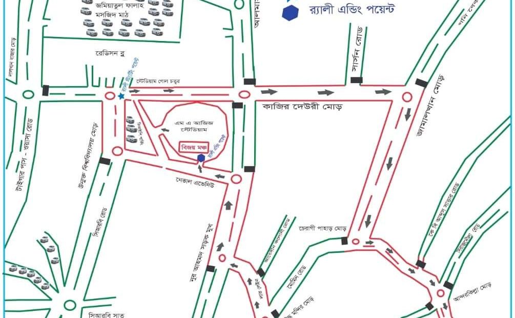 এ ব্যবস্থার অংশ হিসেবে-রোড বøক ও ডাইভারশন পয়েন্ট সমূহ ঃ নগরীর এম.এ আজিজ স্টেডিয়াম গোলচত্বর (বিজয় শিখা) থেকে সকাল সাড়ে ১০টা বিজয় র্যালি আরম্ভ হয়ে কাজির দেউরী মোড়-সার্সন রোড-ডাঃ খাস্তগীর স্কুল-চেরাগী পাহাড় মোড়-জে এম সেন রোড-আন্দরকিল্লা মোড়-বক্সিরহাট মোড়-সোনালী ব্যাংক মোড়-কেসিদে রোড-বোস ব্রাদার্স (পুলিশ প্লাজা)-ডিসি হিল-বৌদ্ধ মন্দির-লাভ লেইন-নুর আহম্মদ সড়ক-নেভাল এ্যাভেনিউ-হেলিপ্যাডের সম্মুখ রাস্তা-বিজয় মঞ্চে এসে শেষ হবে।