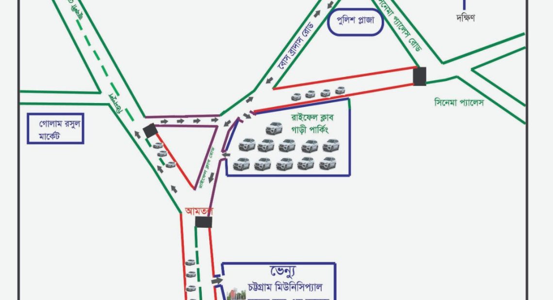 আগামী ২১ ফেব্রæয়ারী মঙ্গলবার মহান শহিদ দিবস ও আন্তর্জাতিক মাতৃভাষা দিবস যথাযথ মর্যাদায় উদযাপনের লক্ষ্যে সরকারীভাবে নগরীর চট্টগ্রাম মিউনিসিপ্যাল মডেল স্কুল এন্ড কলেজ মাঠে স্থাপিত শহীদ মিনারে ভাষা শহীদদের স্মরণে বিভিন্ন অনুষ্ঠানমালার আয়োজন করা হয়েছে। এ উপলক্ষে চট্টগ্রাম মেট্টোপলিটন পুলিশের (সিএমপি) ট্রাফিক-দক্ষিণ বিভাগের পক্ষ থেকে যানবাহন চলাচলে বিশেষ ট্রাফিক নির্দেশনা জারী করা হয়েছে। নিম্নোক্ত নির্দেশনাসমূহ অনুসরণের জন্য বিশেষভাবে অনুরোধ করা হয়েছে। আজ ১৮ ফেব্রæয়ারি শনিবার সন্ধ্যায় উপ-পুলিশ কমিশনার (ট্রাফিক-দক্ষিণ) এন.এম নাসিরুদ্দিন প্রেরিত এক বিজ্ঞপ্তিতে বিষয়টি নিশ্চিত করা হয়েছে। নির্দেশনাগুলো হচ্ছে-আগামী ২০ ফেব্রæয়ারী রাত ৯টা থেকে নগরীর তিনপুল থেকে আমতল, আমতল থেকে নিউ মার্কেট, নিউ মার্কেট থেকে আমতল এবং সিনেমা প্যালেস থেকে রাইফেল ক্লাব রোডে সকল প্রকার যানবাহন চলাচল বন্ধ থাকবে। তিনপুল মোড় থেকে শিক্ষা অফিস হয়ে আমতল পর্যন্ত একমুখী চলাচল বজায় থাকবে। নিউমার্কেট, আমতল, তিনপুল ও সিনেমা প্যালেস মোড়ে রোড বøক স্থাপন করে যানবাহনসমূহ ডাইভারশন দেওয়া হবে। শহীদ মিনারে পুষ্পস্তবক অর্পণ করতে আসা সকল গুরুত্বপূর্ণ ব্যক্তিবর্গ ও সরকারী কর্মকর্তাগণ ওয়াসা-কাজির দেউরী-নেভাল ক্রসিং-লাভ লেইন-বৌদ্ধ মন্দির-বোস ব্রাদার্স-রাইফেল ক্লাব হয়ে আমতল মোড় ড্রপিং জোন হিসেবে ব্যবহার করবেন এবং পরবর্তীতে প্রধান পার্কিং স্থান হিসেবে রাইফেল ক্লাব মাঠে গাড়ি পার্কিং করবেন। এছাড়াও অন্যদিক থেকে আসা গাড়িসমূহ নিজ নিজ সুবিধা অনুযায়ী নিউমার্কেট মোড় এবং তিনপুল (গোলাম রসুল মার্কেটের সামনে) ড্রপিং জোন হিসেবে ব্যবহার করতে পারবেন। অনুষ্ঠানস্থলে আসা সকল গুরুত্বপূর্ণ ব্যক্তিবর্গ ও সরকারী কর্মকর্তাগণ আমতল হতে পায়ে হেঁটে শহীদ মিনারে (চট্টগ্রাম মিউনিসিপ্যাল মডেল স্কুল এন্ড কলেজ) এসে ফুল দিয়ে পুনঃরায় আমতল মোড়ে গিয়ে গাড়িতে উঠে জুবলী রোড হয়ে প্রত্যাবর্তন করবেন। নিউ মার্কেট ও তিনপুল ড্রপিং জোন হিসেবে ব্যবহারকারীগণ পায়ে হেঁটে শহীদ মিনারে গিয়ে পুষ্পস্তবক অর্পণপূর্বক পূনরায় উক্ত ড্রপিং জোনসমূহে গিয়ে গাড়িতে উঠবেন। পদযাত্রা ও প্রভাতফেরিতে অংশগ্রহণকারীগণ সুশৃঙ্খলভাবে রাস্তায় যান চলাচলের সুযোগ রেখে গমনাগমন করবেন। মহান শহিদ দিবস ও আন্তর্জাতিক মাতৃভাষা দিবস সুষ্ঠু, সুশৃঙ্খল ও যথাযোগ্য মর্যাদায় পালনের জন্য নগরবাসীর সর্বাত্মক সহযোগিতা প্রত্যাশা করা হচ্ছে। ###