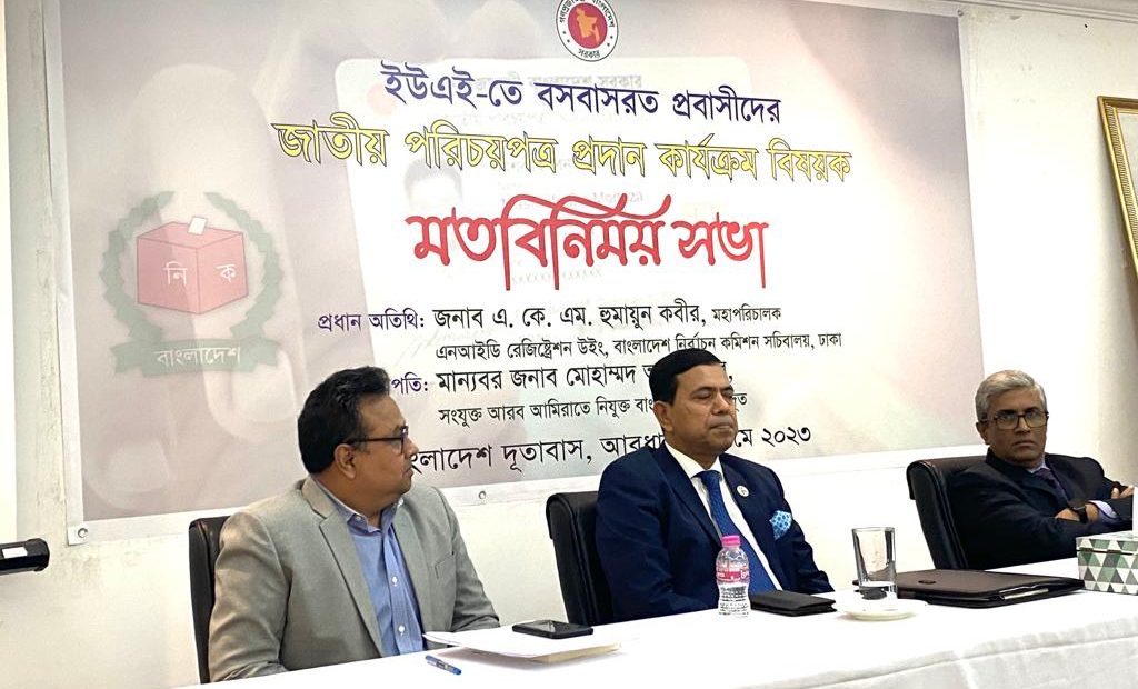 আজ আবুধাবিস্থ বাংলাদেশ দূতাবাসে ইউ এইতে বসবাসরত বাংলাদেশী বলছি বাংলাদেশীদের জাতীয় পরিচয় পত্র প্রদান কার্যক্রম বিষয়ক এক মত বিনিময় সভা অনুষ্ঠিত হয়। এতে প্রধান অতিথি ছিলেন বাংলাদেশ নির্বাচন কমিশনের এনআইডি রেজিস্ট্রেশন উইং এর মহাপরিচালক এ কে এম হুমায়ুন কবীর। অনুষ্ঠানে সভাপতিত্ব করেন ইউএইতে নিযুক্ত বাংলাদেশের রাষ্ট্রদূত মোহাম্মদ আবু জাফর। সভায় এনআইডি কার্যক্রম সংক্রান্ত নানা বিষয়ের উপর নির্বাচন কমিশন কর্তৃপক্ষের সাথে খোলাখুলি মত বিনিময় করেন প্রবাসীরা। অনুষ্ঠানে ইতিপূর্বে এনআইডি’র জন্য আবেদনকারীদের মধ্যে স্মার্ট কার্ড বিতরণ করা হয়।