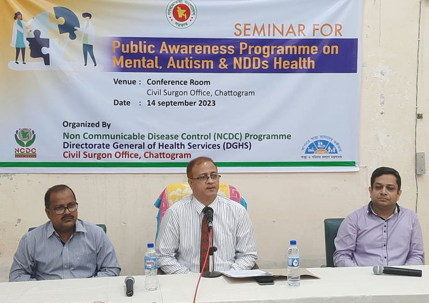 চট্টগ্রাম জেলা সিভিল সার্জন ডা. মোহাম্মদ ইলিয়াছ চৌধুরী বলেছেন, শারীরিক স্বাস্থ্যের পাশাপাশি মানসিক স্বাস্থ্যের প্রতি দায়িত্বশীল হতে হবে। জাতির পিতা বঙ্গবন্ধু শেখ মুজিবুর রহমানের সুযোগ্য কন্যা মাননীয় প্রধানমন্ত্রী শেখ হাসিনা সব ধরণের স্বাস্থ্যসেবা জনগণের কাছে পৌঁছে দিতে নিরলসভাবে কাজ করে যাচ্ছেন। স্মার্ট বাংলাদেশ বিনির্মাণে চিকিৎসকসহ চিকিৎসাসেবার কাজে নিয়োজিতদেরকে আরও আন্তরিক হতে হবে। আজ ১৪ সেপ্টেম্বর বৃহস্পতিবার বিকেল সাড়ে ৩টায় জেলা সিভিল সার্জন কার্যালয়ের সম্মেলন কক্ষে অনুষ্ঠিত মানসিক, অটিজম ও এনডিডি স্বাস্থ্য সম্পর্কিত জনসচেতনতামূলক সেমিনারে সভাপতির বক্তব্যে তিনি এসব কথা বলেন।