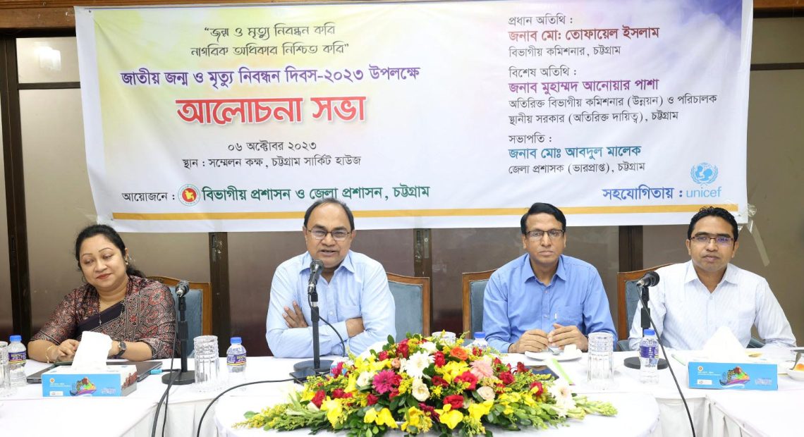 চট্টগ্রাম বিভাগীয় কমিশনার মোঃ তোফায়েল ইসলাম বলেছেন, জম্ম নিবন্ধন ও মৃত্যু নিবন্ধন প্রত্যেকনাগরিকের মৌলিক অধিকার। বর্তমানে সরকারি-বেসরকারী সুযোগ-সুবিধা নিতে হলে প্রথমে প্রয়োজন জন্ম নিবন্ধন। তাই একটি শিশু জন্ম নেওয়ার পর ৪৫ দিনের মধ্যে বিনা খরচে জন্ম নিবন্ধন করা যায়। প্রতিটি শিশুকে যোগ্য নাগরিক হিসেবে গড়ে তোলা আমাদের সবার দায়িত্ব। শিশু জন্মের সঙ্গে সঙ্গে যাতে সে নাগরিকত্ব পায় সে জন্য সরকার জন্ম নিবন্ধন ব্যবস্থাকে আরো শক্তিশালী করেছে। পাশাপাশি মৃত্যু নিবন্ধনকেও বাধ্যতামূলক করেছে সরকার। জাতীয় জন্ম ও মৃত্যু নিবন্ধন দিবস উপলক্ষে আজ ৬ অক্টোবর শুক্রবার সকালে চট্টগ্রাম সার্কিট হাউজে বিভাগীয় ও জেলা প্রশাসন আয়োজিত আলোচনা সভায় প্রধান অতিথির বক্তব্যে তিনি এসব কথা বলেন। দিবসটির এবারের প্রতিপাদ্য বিষয় ছিল “জন্ম ও মৃত্যু নিবন্ধন করি, নাগরিক অধিকার নিশ্চিত করি”। দিবসটি উপলক্ষে আলোচনা সভার পূর্বে বিভাগীয় কমিশনারের নেতৃতে সার্কিট হাউজ থেকে একটি বর্ণাঢ্য র্যালি বের করা হয়। র্যালিটি প্রধান প্রধান সড়ক প্রদক্ষিণ করে।