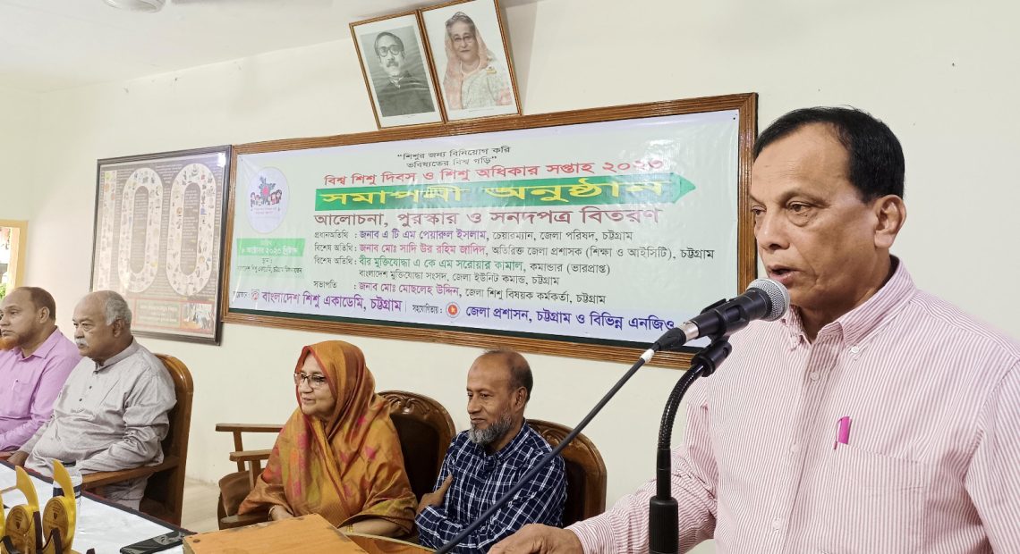 আজ ৮ অক্টোবর ২০২৩ ইংরেজি রোববার সকাল ১০টায় বিশ্ব শিশু দিবস ও শিশু অধিকার সপ্তাহ-২০২৩ এর সমাপনী অনুষ্ঠান উপলক্ষে নগরীর ও.আর.নিজাম রোডস্থ জেলা শিশু একাডেমি মিলনায়তনে আয়োজিত আলোচনা সভা ও পুরস্কার বিতরণ অনুষ্ঠানে প্রধান অতিথির বক্তব্যে তিনি এসব কথা বলেন। সরকারের মহিলা ও শিশু বিষয়ক মন্ত্রনালয়ের নির্দেশনায় ও চট্টগ্রাম জেলা প্রশাসনের সহযোগিতায় জেলা শিশু একাডেমি আয়োজিত দিবসটির এবারের প্রতিপাদ্য বিষয় হচ্ছে-“শিশুর জন্য বিনিয়োগ করি, ভবিষ্যতের বিশ্ব গড়ি”। অনুষ্ঠানে বিশ্ব শিশু দিবস ও শিশু অধিকার সপ্তাহ উপলক্ষে আয়োজিত বিভিন্ন প্রতিযোগিতায় বিজয়ীদের মাঝে পুরস্কার ও সনদপত্র বিতরণ করেন প্রধান অতিথি।