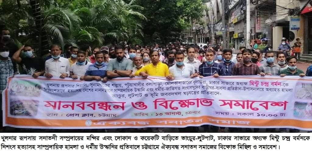 খুলনার রূপসা উপজেলার শিয়ালী গ্রামে সনাতনী সম্প্রদায়ের চারটি মন্দির এবং হিন্দু সম্প্রদায়ের বেশ কিছু দোকান ও কয়েকটি বাড়িতে ভাংচুর-লুটপাট, ঢাকার সাভারে অধ্যক্ষ মিন্টু চন্দ্র বর্মনকে নিশংস হত্যাসহ দেশের বিভিন্ন স্থানে সাম্প্রদায়িক হামলা ও ধর্মীয় উস্কানির প্রতিবাদে চট্টগ্রামে মানববন্ধন ও বিক্ষোভ সমাবেশ অনুষ্ঠিত হয়েছে। শুক্রবার (১৩ আগস্ট) সকাল ১০টায় চট্টগ্রাম প্রেসক্লাব চত্বরে এই মানববন্ধন ও সমাবেশের আয়োজন করে ঐক্যবদ্ধ সনাতন সমাজ। সমাবেশে চট্টগ্রামের সর্বস্তরের সনাতনী সমাজ এবং সকল সনাতনী সংগঠনের নেতাকর্মীরা অংশগ্রহণ করে। সভায় সভাপতিত্ব করেন ঐক্যবদ্ধ সনাতন সমাজের অন্যতম সমন্বয়ক অশোক চক্রবর্তী। সভায় বক্তব্য রাখেন, উত্তর জেলা আওয়ামী লীগের যুগ্ম সম্পাদক দেবাশীষ পালিত, রমনা কালী মন্দিরের উপদেষ্টা মিলন শর্মা, ঐক্যবদ্ধ সমাজের সমন্বয়ক দেবাশীষ আচার্য্য, সনাতন জাগরণ সংঘের সভাপতি শ্রী কাঞ্চন আচার্য্য, জাগো হিন্দু পরিষদের জেলা সভাপতি রুবেল কান্তি দে, বিশ^ সনাতন ঐক্যের সমন্বয়ক সাংবাদিক বিপ্লব পার্থ, প্রণব মঠ-চট্টগ্রামের সাধারণ সম্পাদক অ্যাডভোকেট শুভাশীষ শর্মা, প্রবর্তক ইসকন শ্রীকৃষ্ণ মন্দির পরিচালনা কমিটির সদস্য স্বতন্ত্র গৌরাঙ্গ দাস ব্রহ্মচারী, ঐক্যবদ্ধ সনাতন সমাজের সমন্বয়ক ডা.যীশু দেব, বাংলাদেশ গীতা শিক্ষা কমিটির সহ সভাপতি ডা.কথক দাশ, শিমুল দাশ, হিন্দু মহাজোটের প্রতিনিধি অ্যাডভোকেট যীশু কৃষ্ণ রক্ষিত,ঐক্যবদ্ধ সনাতন সমাজের সমন্বয়ক অ্যাডভোকেট হিরু সুশীল, শারদাঞ্জলি ফোরাম জেলার সভাপতি অজিত শীল, সাধারণ সম্পাদক পিয়াল শর্মা, নন্দনকানন রাধামাধব মন্দিরের সাধারণ সম্পাদক তারননিত্য দাস ব্রহ্মচারী, বাংলাদেশ হিন্দু পরিষদের দক্ষিণ জেলার আহ্বায়ক বিকাশ দাশ, উত্তম দে, ভ্রাম্যমাণ গীতা সংঘের সুদীপ শর্মা, ঐক্যবদ্ধ সনাতন সমাজের সদস্য সুমন সরকার, জাগো হিন্দু পরিষদের সাধারণ সম্পাদক টিটু শীল, অ্যাডভোকেট জুয়েল চন্দ্র দাশ,তপন ধর, অজয় দত্ত, সুজন দাশ, লিংকন তালুকদার, নারীনেত্রী শিল্পী চৌধুরী, জয়া বল, দেবী পরিষদের মুক্তা চক্রবর্তী, প্রান্তী ভট্টাচার্য্য প্রমুখ। সমাবেশ সঞ্চালনা করেন সনাতন সংগঠনের সদস্য অ্যাডভোকেট রাজীব দাশ বাবু ও অ্যাডভোকেট মিথুন বিশ^াস।